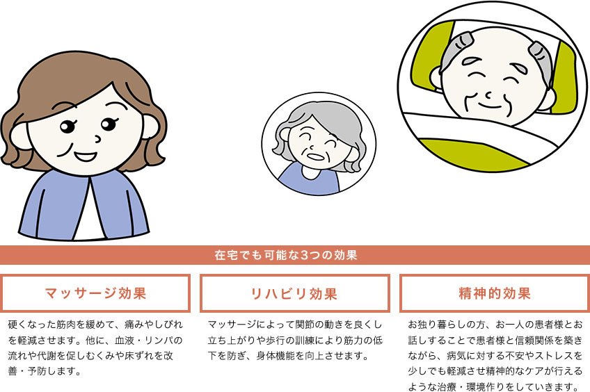 医療保険適用のマッサージです。歩行困難な方や寝たきりの方を対象に、ご自宅に居ながらマッサージ・機能訓練などのサービスが医療保険適用でご利用いただけます。